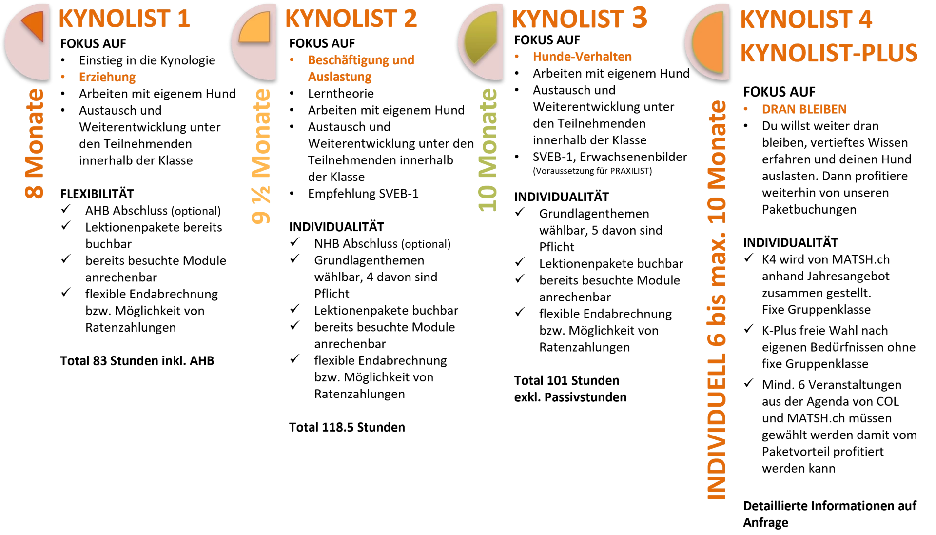 MATSH.ch KYNOLIST K1 bis K3-Lehrgangspakete sind modulare Bausteine, auf denen die MATSH.ch Hundetrainer-Ausbildung PRAXILIST aufgebaut ist. K1 bis K3 bilden somit die Vorausseztung zur Bewerbung zum MATSH.ch PRAXILIST. Kynolist K4 ist ein flexibler modularer Baustein und wird von MATSH.ch anhand Jahresangebot zusammen gestellt. Die Module K1 bis K4 finden innerhalb einer Klasse ab mind. 6 Teilnehmer statt. Der Austausch unter den Teilnehmenden soll dabei nicht zu kurz kommen und bildet einen wichtigen Bestandteil unserer Kynolistenklasse. KYNOLIST Plus bietet die freie Wahl nach eigenen Bedürfnissen ohne fixe Gruppenklasse.